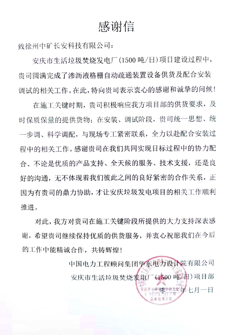 安慶市生活垃圾焚燒發電廠項目致我司感謝信